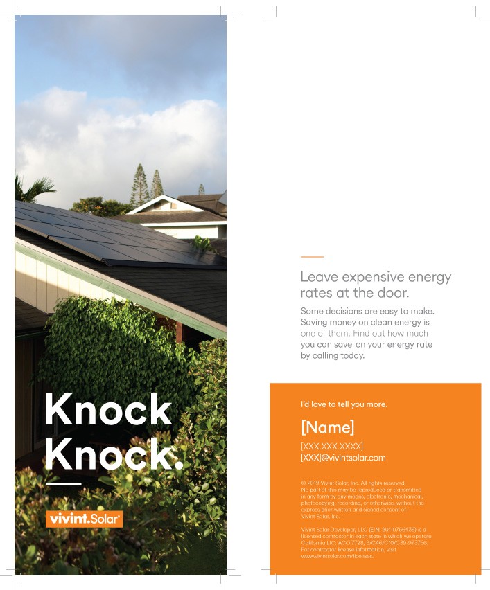 To support Vivint Solar’s sales outreach, I created a series of branded door hangers that allowed representatives to leave clear, structured communication at customer homes. These pieces served as missed-appointment reminders and referral notices, providing essential information in a concise, approachable format. Each hanger combined strong branding with easy-to-read layouts to help customers quickly understand the purpose of the visit and the next steps.